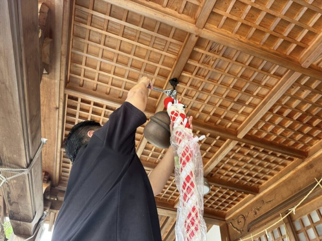 お知らせ2025.10.28八幡神社の鈴雄の新調 ツイート シェア はてブ 送る Pocket 高松の八幡神社様の鈴緒を新調させて頂きました。 鈴緒とは、神社の拝殿正面に吊るされている本坪鈴に結び付けられた縄のことです。 参拝者が鈴緒を揺らすことで鈴が鳴り、神様に参拝を伝える役割を果たします。 ぜひ八幡神社にご参拝の際には、新しい鈴緒を手に取り、お祈りいただければ幸いです。